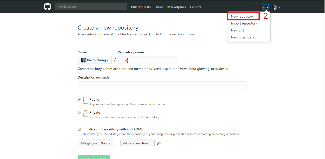 接着我们来创建一个 GitHubPage 的仓库. 创建方式和一般的仓库一样, 但是 仓库名称要和用户名一样. 具体操作如下图: